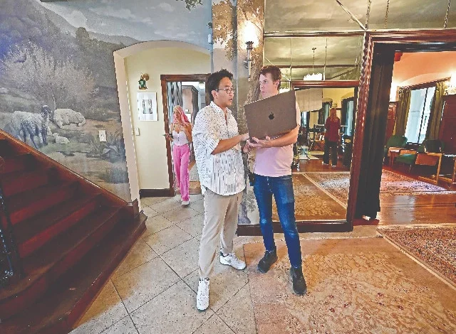 French-Taiwanese producer Vincent Wang and line producer Kyle Vertin talk while filming ‘Love Through All Seasons’ at the Wrensmoor Castle in California. Photo: AFP