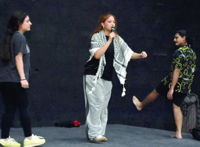 During a dance and music workshop led by Kuwait's LAPA Dance Company, Palestinian performer Rawan Sameer Salamah raised the slogan "Free Palestine" before performing the traditional resistance dance Dabke, wearing a black-and-white keffiyeh.