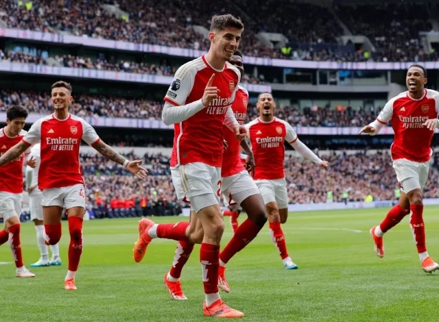 Kai Havertz celebrates scoring Arsenal’s third goal against Tottenham during the first half. Photo: AFP/File