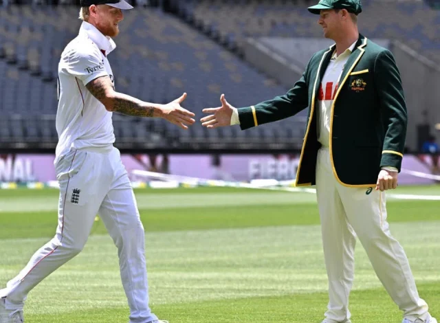 CALM BEFORE THE STORM: Australia captain Steve Smith (R) shakes hands with England captain Ben Stokes at Perth Stadium. Photo: AFP
