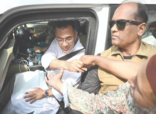 BNP chairman Tarique Rahman greets his supporters as leaves his residence in Dhaka. Photo: AFP