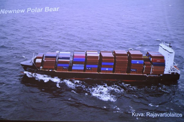 Finnish Border Guard’s photo of a Hong Kong registered cargo ship ‘Newnew Polar Bear’, which was spotted moving close to the Balticconnector gas line, during the joint press conference of the investigation of the possible attack on the Balticconnector gas line on 8th Oct., 2023 between Finland and Estonia at the headquarters of the National Bureau of Investigation in Vantaa, Finland, 24 October 2023. Lehtikuva/HEIKKI SAUKKOMAA via REUTERS Acquire Licensing Rights