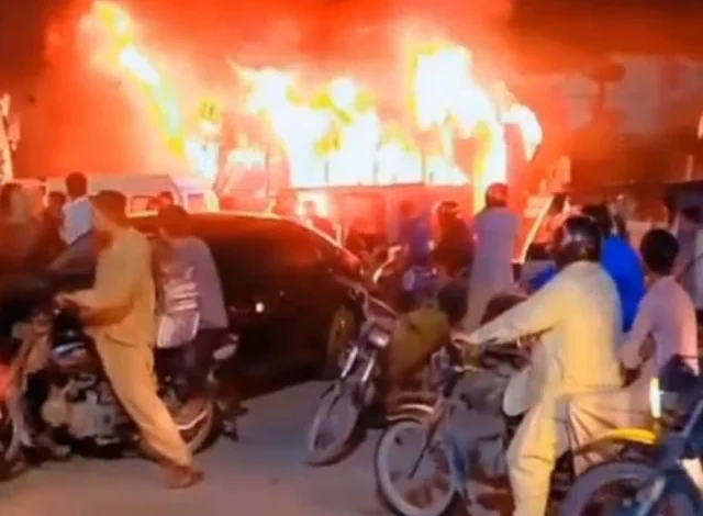 Flames rise from a passenger coach set ablaze by an angry mob after a speeding bus fatally hit a man and injured his nephew in Karachi’s Korangi Industrial Area. Photo: Express