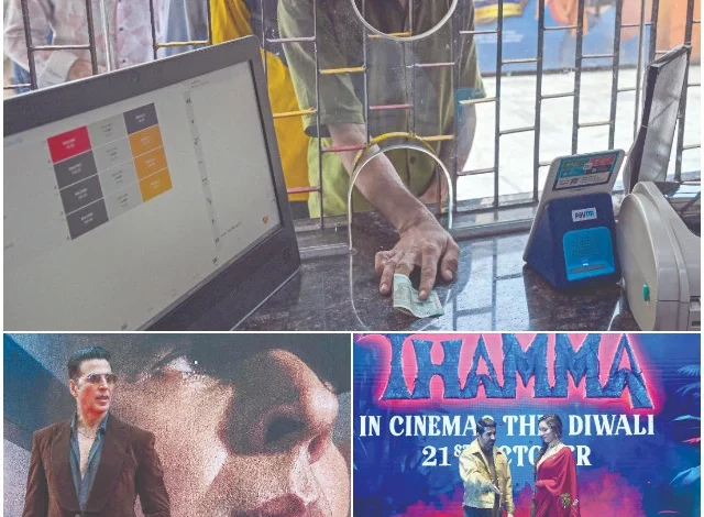 File photos of moviegoers queuing to purchase tickets for ‘Dilwale Dulhania Le Jayenge’ at Maratha Mandir theatre in Mumbai; actors Ayushmann Khurrana and Shraddha Kapoor posing during the trailer launch of their film ‘Thamma’ in Mumbai and actor Akshay Kumar posing for photographs during an event for the promotion of his film ‘Sky Force’ in Mumbai. Photos: AFP