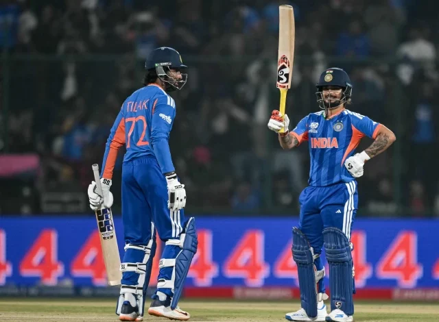 India’s Ishan Kishan celebrates after scoring a half-century during the 2026 ICC Men’s T20 Cricket World Cup group stage match between India and Namibia at the Arun Jaitley Stadium in New Delhi on February 12, 2026. Photo: AFP