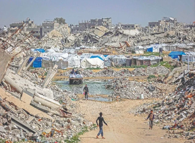 Boys walk past the rubble of destroyed buildings in the Jabalia camp for Palestinian refugees in the northern Gaza Strip. Photo: AFP