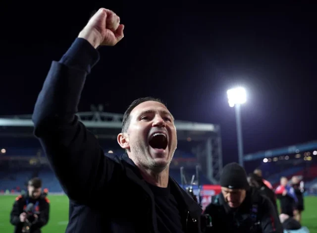 Frank Lampard celebrates as Coventry City secure Premier League promotion after 25 years, completing a remarkable managerial turnaround. Photo: AFP/FILE