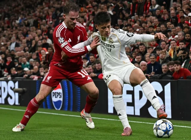 Real Madrid’s Arda Guler (R) vies with Liverpool’s Alexis Mac Allister (L) during the UEFA Champions League match at Anfield, Liverpool. PHOTO: AFP