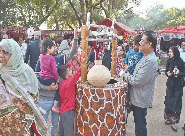 Visitors enjoy exploring traditional cultural displays at the Lok Mela 2025, a ten-day annual folk festival at Lok Virsa, Islamabad, showcasing Pakistan’s diverse heritage and craftsmanship. Photo: APP