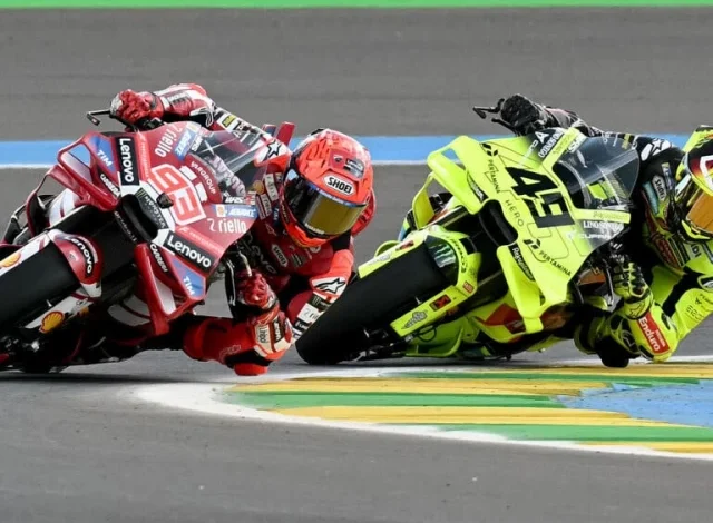 With two laps to go, Di Giannantonio, who has never won a sprint race, wobbled and Marquez shot past. The Italian was on the Spaniard’s rear wheel throughout the last lap but Marquez filled every potential hole.