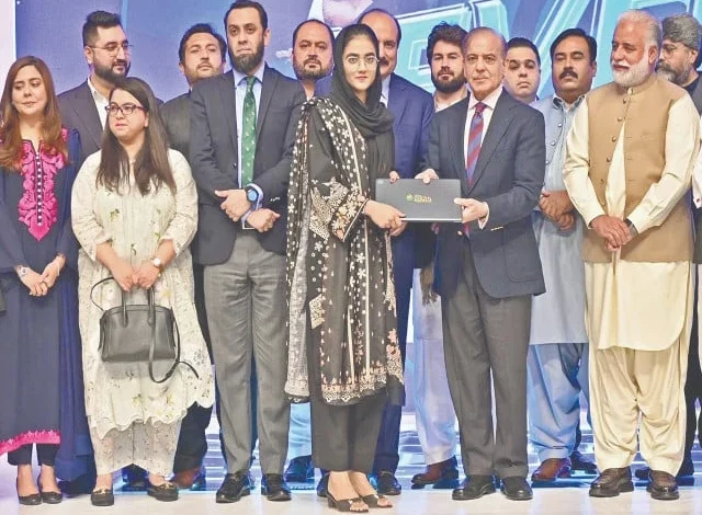 Prime Minister Shehbaz Sharif awards a laptop to a student in Islamabad. Photo: Online