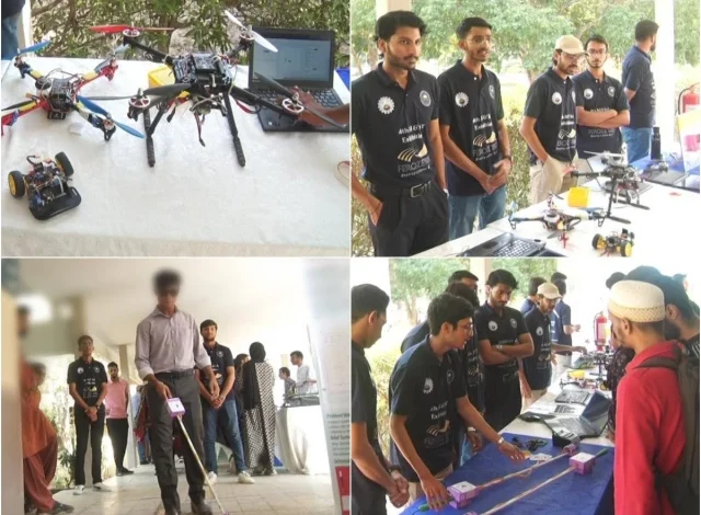 From the Mechanical Engineering Department, another interesting project was presented, an AI-based drone system for cleaning solar panels. Developed at a cost of Rs150,000, the drone uses high-tech cameras and AI to automatically detect dust and dirt on solar panels and activate its cleaning mechanism.