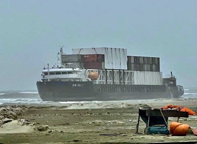 Hang Tong got stuck due to high sea waves and faulty engine while it was returning after offloading shipments at the Karachi port. PHOTO COURTESY: MMNEWS.TV