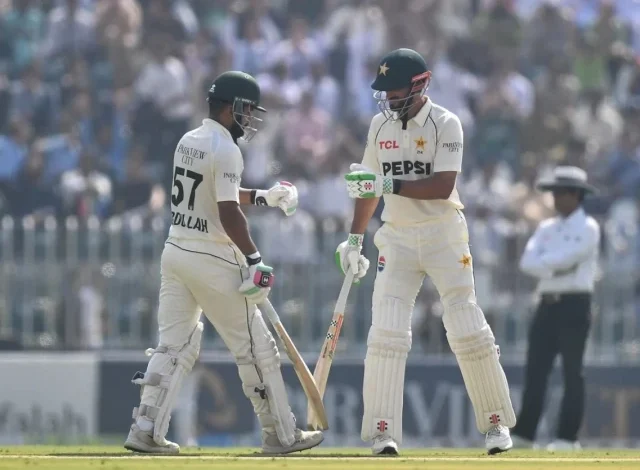 Saud Shakeel and Salman Agha will resume on Tuesday unbeaten on 42 and 10 respectively, with the home team seeking a 2-0 series win against the world Test champions.
