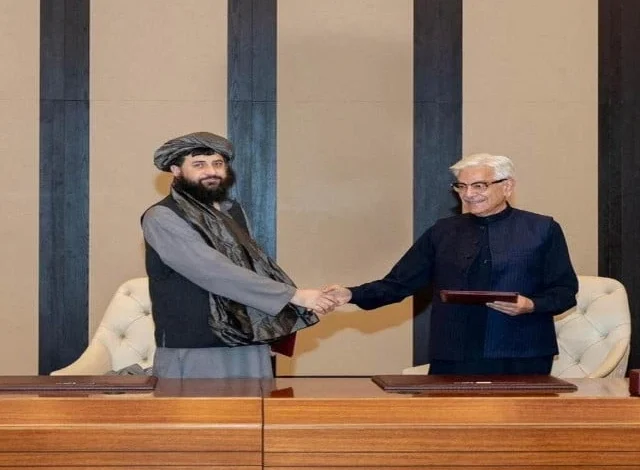 Defence Minister Khawaja Muhammad Asif and Afghan Defence Minister Mullah Mohammad Yaqoob Mujahid shake hands following the signing of a ceasefire agreement mediated by Qatar and Turkey in Doha on October 19. Photo: Reuters