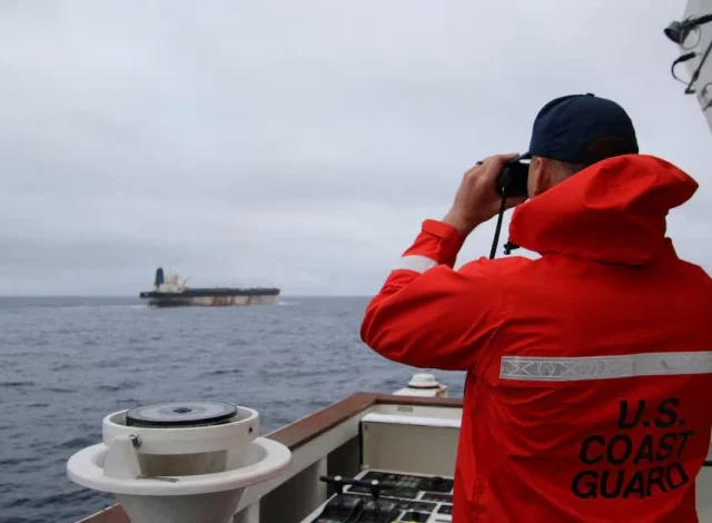 A U.S. Coast Guard official looks through binoculars at the ship Marinera (Ex-Bella 1) in this handout image released January 7, 2026. US EUROPEAN COMMAND via X/Handout via REUTERS