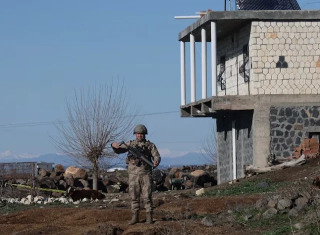 A Turkish soldier stands guard as army and security personnel search a field after a piece of ammunition fell following the interception of a missile launched from Iran by a NATO air defence system, in Diyarbakir, Turkey, March 9, 2026. PHOTO: REUTERS