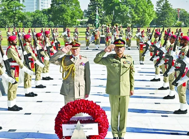 British Army’s CGS Gen Sir Charles Roland Vincent Walker lays a floral wreath at Yadgar-i-Shuhada. Photo: APP
